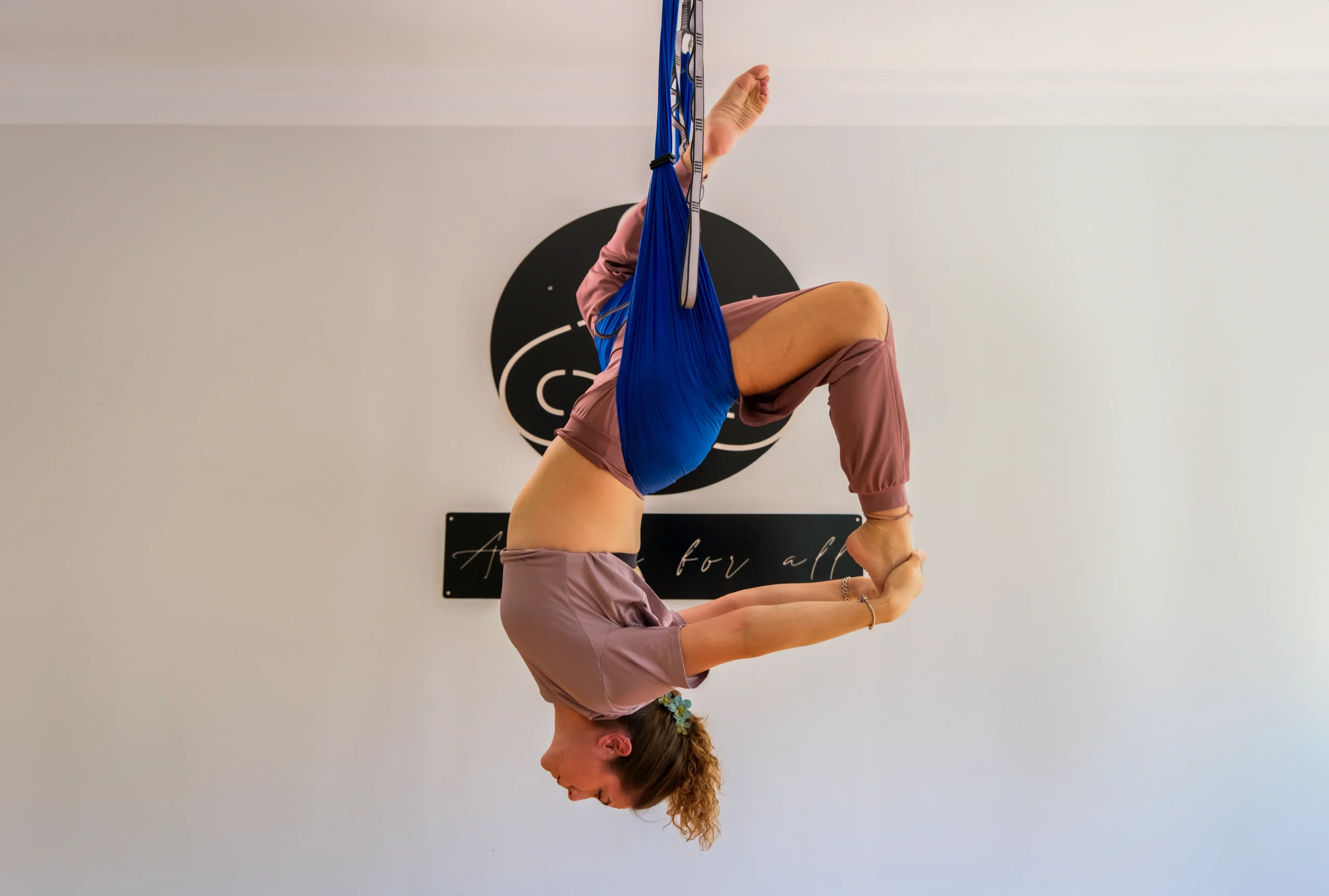 Özel hamaklarla yapılan, omurga sağlığını destekleyen esnek yoga deneyimi.